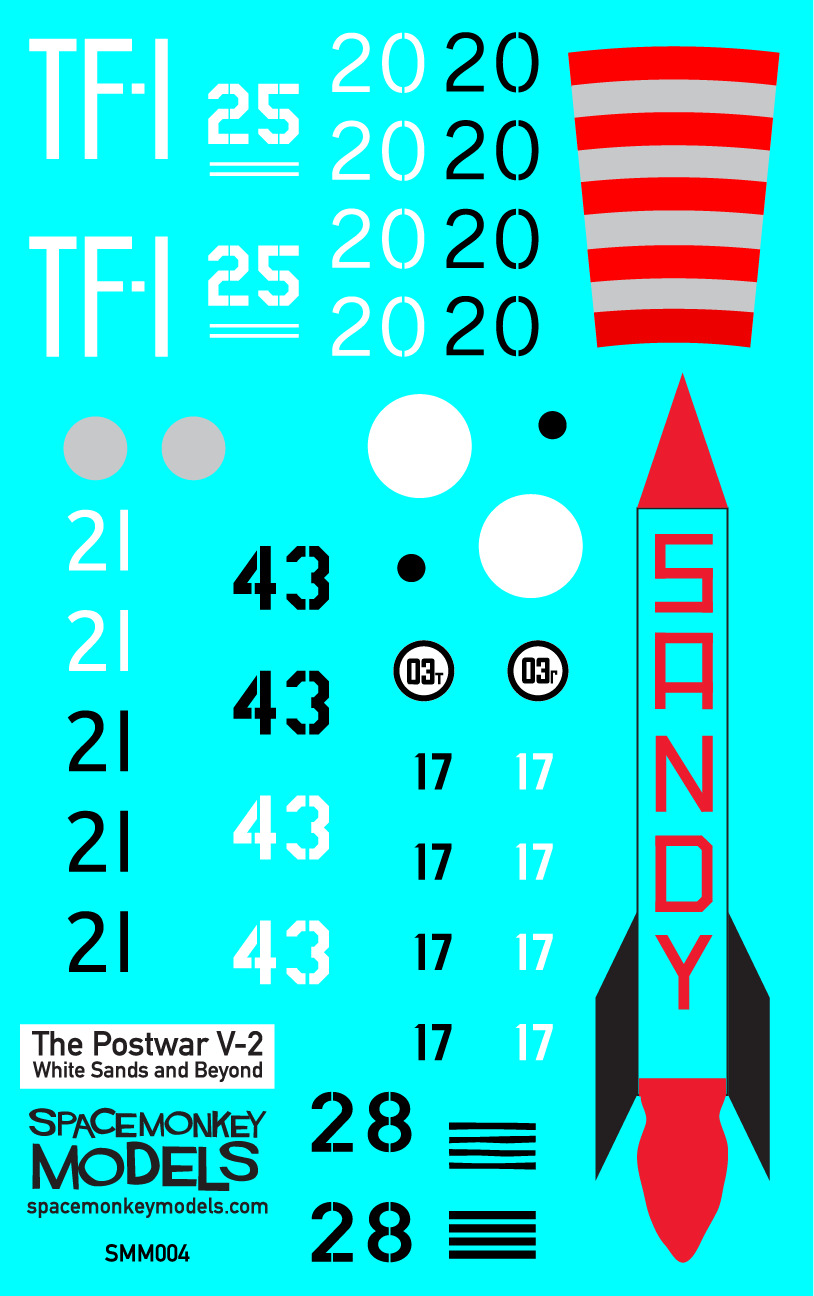 Our V-2 kit will return soon with an all new decal sheet, documenting multiple examples from the post-World War II era of the rocket. Standing in at 23” tall, The Spacemonkey Models V-2 kit is a 1/24 scale plastic model assembly kit of the World War II-era German V-2 ballistic missile and postwar research rocket. Molded in the USA from high-impact polystyrene, this new 2026 version of our features markings for nine different post-World War II V-2 variants, printed in Ohio by Champion Graphics.